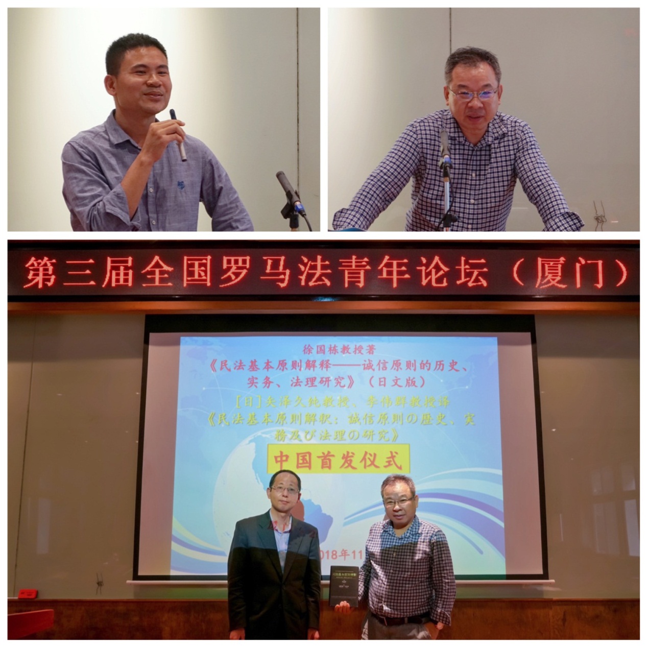 论坛的闭幕式也是徐国栋老师的《民法基本原则解释》(日文版)(矢泽久纯、李伟群译)在中国的首发仪式。该部分由厦门大学法学院陈帮锋老师主持。首先,徐老师对远道而来的矢泽久纯教授表示感谢,他说矢泽教授出席本次论坛,是中日法律文化的一次友好交流。其次,他对本次论坛进行了总结与展望,表达了对论坛报告者研究态度的赞赏,肯定“矿工们”直接对第一手原始资料的挖掘、研究。他指出当代青年罗马学者是充满学术骄傲的一代,研究相对自主,并且领域相比以往更加广泛,研究视角更加多样化。他还对与会者勤勉认真的会风表示赞赏。最后,徐老师对此次论坛组织者齐云老师、陈帮峰老师以及会务组的同学们表示衷心感谢,感谢他们为本次会议的圆满召开作出的贡献。本次论坛在与会嘉宾们的掌声中落下帷幕。